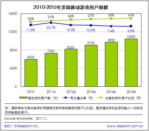 iResearch艾瑞咨詢(xún)根據(jù)eMarketer最新發(fā)布數(shù)據(jù)發(fā)現(xiàn),2010年美國(guó)移動(dòng)游戲用戶(hù)規(guī)模為6020萬(wàn)人,同比增長(zhǎng)11.8%,占美國(guó)移動(dòng)手機(jī)用戶(hù)比例為26%;預(yù)計(jì)未來(lái)五年內(nèi),用戶(hù)規(guī)模將保持持續(xù)增長(zhǎng)勢(shì)態(tài),2011年將出現(xiàn)一個(gè)較高的增長(zhǎng)點(diǎn),移動(dòng)游戲用戶(hù)數(shù)將達(dá)到7350萬(wàn)人,同比增長(zhǎng)22.1%,在移動(dòng)手機(jī)用戶(hù)中的滲透率達(dá)31%;之后增長(zhǎng)將逐漸趨緩,到2015年用戶(hù)規(guī)模將突破一億,達(dá)到1.05億,同比增長(zhǎng)率降為6.9%,滲透率達(dá)41%。