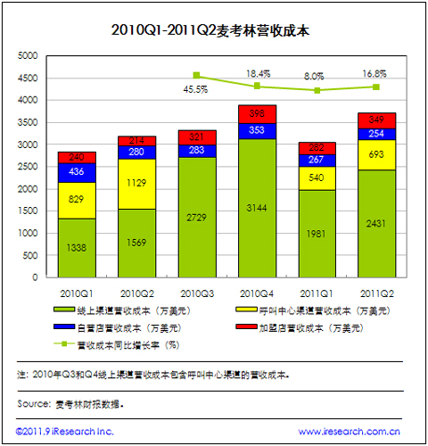2011Q2麥考林運(yùn)營(yíng)費(fèi)用為2688萬(wàn)美元,同比增加22.6%。據(jù)麥考林CFO披露,2011Q2市場(chǎng)營(yíng)銷費(fèi)用收入的比例為14%,即822萬(wàn)美元(2011Q1市場(chǎng)營(yíng)銷費(fèi)用收入比例為13%,即625萬(wàn)美元,且60%用于線上渠道,40%用于呼叫中心渠道),行政與管理費(fèi)用達(dá)到1774萬(wàn)美元的水平。