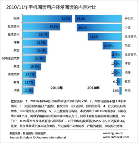 據(jù)易觀國際(Analysys International)最新報告《2011年中國手機閱讀市場用戶研究報告》(以下簡稱《報告》)研究發(fā)現(xiàn),報紙、生活資訊、社交資訊等類微內(nèi)容超越文學(xué)作品等長內(nèi)容成為手機閱讀用戶的習(xí)慣性閱讀內(nèi)容。