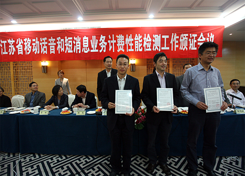 會上,檢測單位公布了移動話音和短消息業(yè)務計費檢測的相關標準和本次計費檢測的合格清單。省通信管理局向江蘇電信、江蘇移動、江蘇聯(lián)通共39家地市公司頒發(fā)了移動話音和短消息業(yè)務計費性能檢測合格證書。
