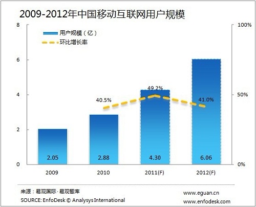 基于EnfoDesk易觀智庫對移動互聯(lián)網(wǎng)的持續(xù)研究,預(yù)計2012年市場用戶規(guī)模及從移動互聯(lián)網(wǎng)市場規(guī)模保持相對穩(wěn)定的增長,移動互聯(lián)網(wǎng)用戶數(shù)有機會在2012年突破6億,并且超過互聯(lián)網(wǎng)用戶數(shù)量,智能終端、移動互聯(lián)網(wǎng)應(yīng)用繼續(xù)延續(xù)2011年的增長速度。