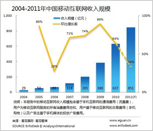 2011年中國移動互聯(lián)網(wǎng)市場規(guī)模達851億