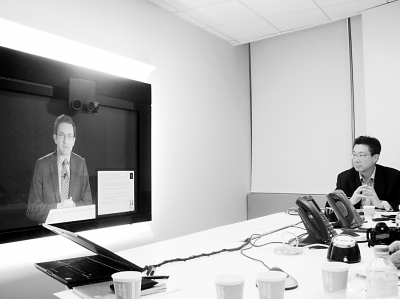 圖:Orange網(wǎng)絡(luò)解決方案業(yè)務(wù)部副總裁Nicolas Roy在巴黎演講,Orange中國區(qū)首席技術(shù)官劉昕(右)在主持北京視頻會議現(xiàn)場