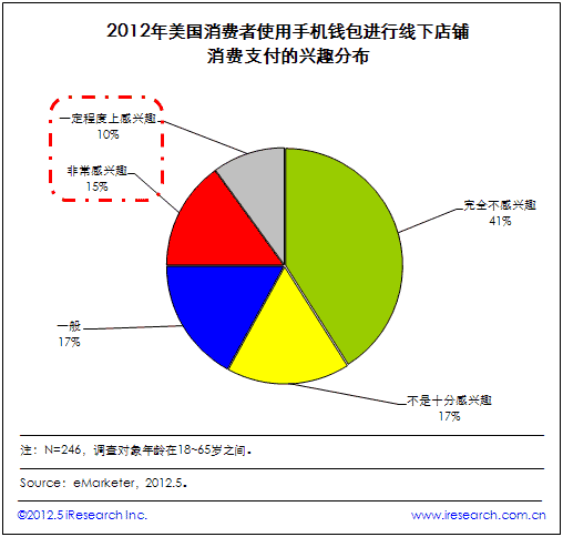 iResearch艾瑞咨詢整理eMarketer調(diào)查數(shù)據(jù)發(fā)現(xiàn),盡管手機(jī)支付市場(chǎng)增速迅猛,但其在美國(guó)消費(fèi)者中的接受程度相對(duì)較低。數(shù)據(jù)顯示,被調(diào)查者中只有1/4的美國(guó)用戶對(duì)使用手機(jī)錢包在線下店鋪消費(fèi)感興趣,而相比之下,58%的消費(fèi)者對(duì)手機(jī)錢包技術(shù)不感興趣,其中包括41%的人完全沒興趣。