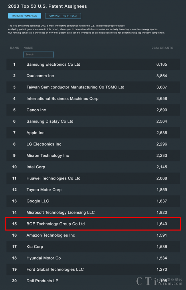 BOE(京東方)位列2023 IFI專(zhuān)利授權(quán)排行榜全球第15位