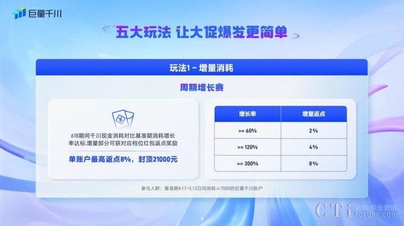 一、「周期增長賽」:針對在618好物節(jié)期間現(xiàn)金消耗對比基準(zhǔn)期消耗增長率達(dá)標(biāo)的商家,增量部分可獲得對應(yīng)檔位紅包返點(diǎn)獎(jiǎng)勵(lì),單賬戶最高返點(diǎn)8%,封頂21000元。