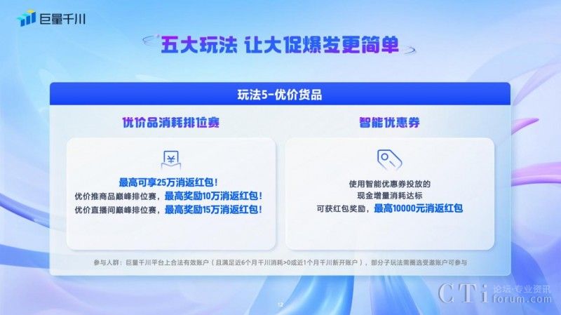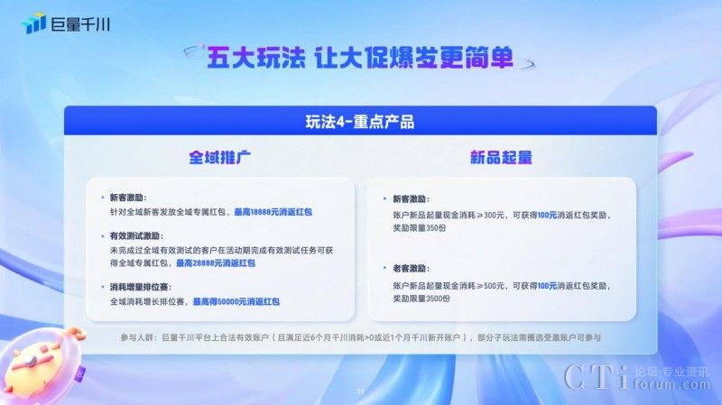 四、「重點(diǎn)產(chǎn)品玩法」:「全域推廣」和「新品起量」兩個(gè)巨量千川平臺重點(diǎn)產(chǎn)品,也推出了系列玩法。全域推廣對新客、完成有效測試的客戶發(fā)放全域推廣專屬紅包,最高達(dá)28888元,參與全域增長消耗排位賽也可獲得高達(dá)50000元的消返紅包。新品起量基準(zhǔn)期新客現(xiàn)金消耗≥300元,可獲得100元消返紅包獎(jiǎng)勵(lì),老客現(xiàn)金消耗≥500元,即可得到100元消返紅包獎(jiǎng)勵(lì)。
