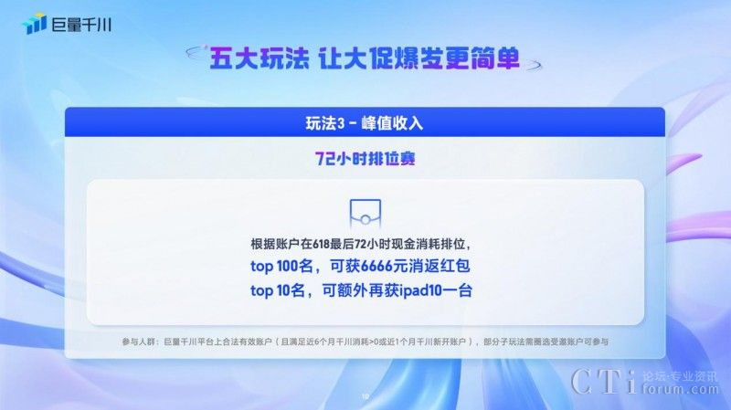 三、「72小時(shí)排位賽 」:針對巨量千川平臺上合法有效賬號,且滿足近6個(gè)月千川消耗>0或近1個(gè)月千川新開賬戶,按照商家的峰值收入可以參與72小時(shí)排位賽,根據(jù)賬戶在618最后72小時(shí)現(xiàn)金消耗進(jìn)行排位,排位Top100的商家可得6666元消返紅包,Top10可額外再得ipad10一臺。