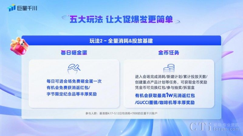 二、「每日砸金蛋&金幣任務(wù)」:針對在618好物節(jié)期間現(xiàn)金消耗對比基準(zhǔn)期消耗增長率未達(dá)標(biāo)的商家,可參與每日砸金蛋和金幣任務(wù)。商家每日可進(jìn)入會場免費(fèi)砸金蛋一次,就有機(jī)會免費(fèi)獲得消返紅包和字節(jié)限定紀(jì)念品等獎(jiǎng)勵(lì)。此外,商家進(jìn)入會場完成消耗/新建計(jì)劃/累計(jì)投放天數(shù)/創(chuàng)建重點(diǎn)產(chǎn)品計(jì)劃等任務(wù),可獲取金幣獎(jiǎng)勵(lì),憑金幣可兌換紅包、參與抽獎(jiǎng)和拆盲盒等豐厚獎(jiǎng)勵(lì),最高可得10000元消返紅包。