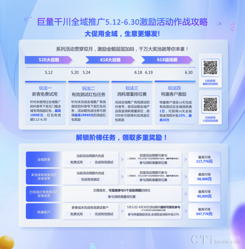 在此次巨量千川618好物節(jié)期間,全域推廣系列活動貫穿雙月,激勵(lì)金額層層加碼,更有多重獎(jiǎng)勵(lì),獎(jiǎng)池金額累積千萬。全域推廣針對全域新客發(fā)放高達(dá)18888元的全域推廣專屬紅包;對于未完成全域有效測試的商家在活動期完成有效測試任務(wù)可獲得最高28888元的消返紅包;以及參與全域推廣消耗排位賽,最高可得50000元消返紅包;對于特邀客戶首投14天完成有效測試且全域消耗滿1萬,可獲得14天全域現(xiàn)金消耗補(bǔ)貼10%,最高達(dá)30萬。