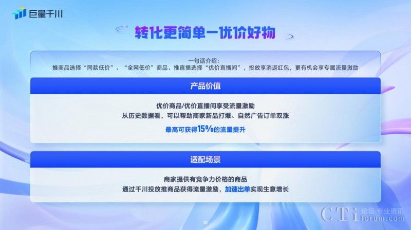 提升用戶的購買體驗(yàn)也是商家的關(guān)注點(diǎn),隨著消費(fèi)者購物習(xí)慣的不斷變化,94%的消費(fèi)者在購物時(shí)有比價(jià)的習(xí)慣,因此商家在激勵(lì)的競爭下提供有競爭力的商品疊加穩(wěn)定的價(jià)格體系,是實(shí)現(xiàn)有效經(jīng)營和提升用戶體驗(yàn)的關(guān)鍵。為更好的滿足商家需求,讓好產(chǎn)品被更多的人看到,具有價(jià)格力的「優(yōu)價(jià)好物」,會為商家增長帶來新動力,讓轉(zhuǎn)化變得更簡單。