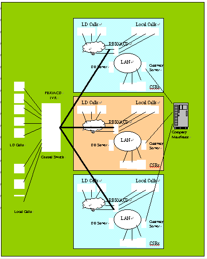 。。網(wǎng)絡式呼叫中心定義如下:該呼叫中心具備轉(zhuǎn)移呼叫來話的能力,可以在沒有可以利用的客戶服務代表的時候,將來話轉(zhuǎn)移給另一個呼叫中心。這種來話路由的功能是即復雜又初級,該功能可以由呼叫中心管理人員或者電話服務提供商所控制。對于網(wǎng)絡式呼叫中心的設計而言,從根本上來說與獨立式呼叫中心非常相似,只是具備了內(nèi)部聯(lián)網(wǎng)線路,或者稱為虛擬專用網(wǎng)(VPN)。在同一個網(wǎng)絡框架下,每個呼叫中心之間都配置了相同的設備,包括電話程控交換機、ACD、IVR和CTI等,就其中的某一個呼叫中心而言又是相對獨立的。與獨立式呼叫中心相比,網(wǎng)絡式呼叫中心最顯著的特點是將各個獨立的呼叫中心相連,包括語音信息與數(shù)據(jù)信息。這種手段有ISDN,E-1,甚至利用VoIP的方式。請見下圖。