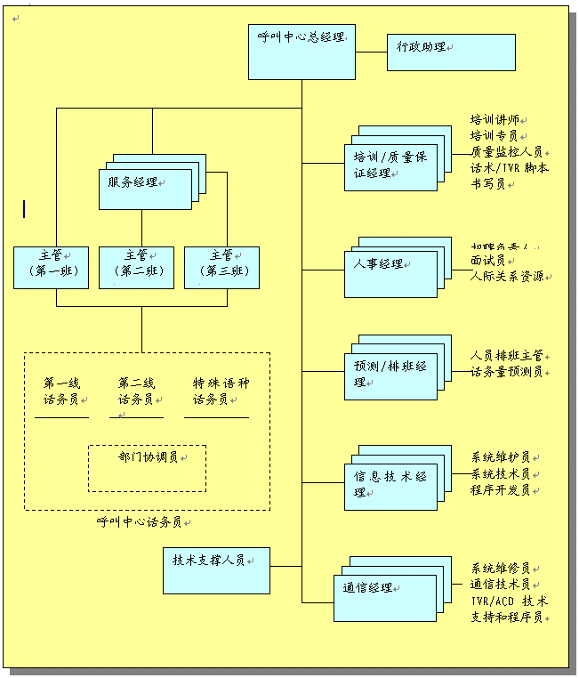 呼叫中心組織結(jié)構(gòu)概述了中心的任務(wù)和職責(zé)。對組織進(jìn)行了統(tǒng)籌安排以便中心能有效達(dá)到工作目標(biāo),組織安排主要有: