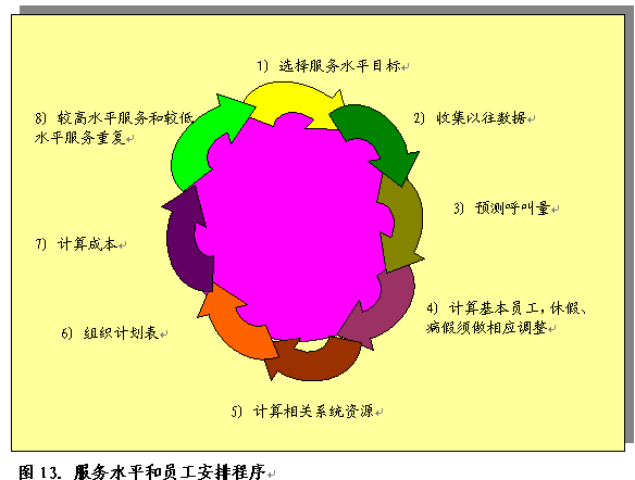 制訂員工工作時間表是一個重要的管理任務(wù),每天通過三次替換有效配置員工,從而提供一年365天,24小時x7天的服務(wù)。可利用ACD報告進行這一工作,確定以往呼叫量、放棄率和高峰期,預(yù)計下個小時、下一天、下個月或下一年的呼叫量。管理層按照規(guī)定程序確定員工需求量。根據(jù)以往呼叫量確定員工需求量。