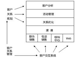 真正的CRM解決方案是一個(gè)復(fù)雜的聯(lián)合體,它由許多組件(即分析工具、活動(dòng)管理與事件引發(fā)等)與許多需要用來(lái)達(dá)到一對(duì)一的營(yíng)銷能力(如間接管理、基于規(guī)章制度的工作流管理以及真正的渠道管理等)的新組件共同組成。此外,在非客戶聯(lián)系系統(tǒng)(如企業(yè)資源規(guī)劃與操作)與客戶聯(lián)系系統(tǒng)之間必須有接口。最后,在企業(yè)內(nèi)建立一套完整的便于知識(shí)管理的反饋循環(huán)系統(tǒng)也很必要。