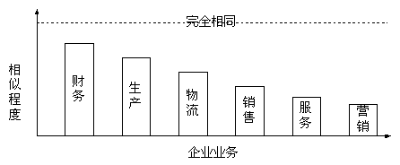 很顯然,企業(yè)間業(yè)務(wù)的相似程度越高,采用商用軟件的有效率越高,企業(yè)在采用商用軟件的時(shí)候軟件的客戶化定制就越少,實(shí)施的成功率越高。財(cái)務(wù)軟件是目前商用軟件通用最有效的企業(yè)管理軟件就是明證。從圖中可以看出前面的幾種業(yè)務(wù),是 傳統(tǒng)ERP軟件支持的功能;而后面的銷售、服務(wù)和市場(chǎng)是目前CRM軟件所要實(shí)現(xiàn)的功能。如果說,企業(yè)采用現(xiàn)有的ERP商品套件來滿足企業(yè)運(yùn)營管理的需要還需要30%的客戶化工作,那么如果采用商用的CRM軟件,軟件廠商提供的軟件要應(yīng)用于企業(yè),就需要更多的客戶化工作,這個(gè)比例幾乎接近于企業(yè)自己開發(fā)。