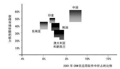 亞太地區(qū)正在成為CRM應(yīng)用軟件的新興市場。1999年亞太地區(qū)CRM市場的年增長率達33.5%。其中中國CRM市場是除日本外最具發(fā)展?jié)摿Φ氖袌。預(yù)計到2004年,中國CRM市場的復(fù)合年平均增長率為60%。