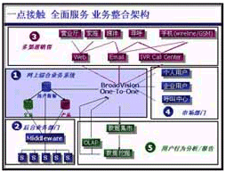 在“一對一模式”中,BroadVision公司可以為原有后臺系統(tǒng)提供有機(jī)的整合(如連接用戶的記費、業(yè)務(wù)、用戶數(shù)據(jù)系統(tǒng)),使其在前臺可提供多種用戶的接入手段,形成業(yè)務(wù)的完整流程,如通過多種接入手段提供查詢、咨詢、受理、投訴等業(yè)務(wù);電信企業(yè)還可通過此平臺提供增值業(yè)務(wù),如電子商務(wù)、信息服務(wù)、代繳費等。