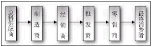 在社會化大生產(chǎn)的前提下,任何商品被制造和被消費的過程,實際上是在多個環(huán)節(jié)、多個商家進(jìn)行“傳遞”的過程,這一過程構(gòu)成的“通道”就是“供應(yīng)鏈”。供應(yīng)鏈的研究就是從分銷模式開始的。在分銷模式下,最常見的價值傳遞的通道如下圖所示: