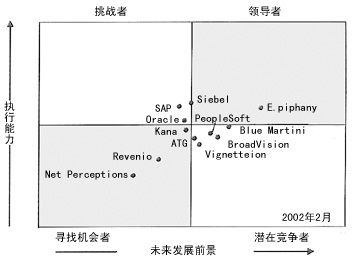 Siebel 和Oracle因為在其CRM中整合了E-Marketing以及公司強大的資金實力,因此在挑戰(zhàn)者中最為引人注目。預計Siebel 將在6到12個月內(nèi)進入E-Marketing市場的領導者行列。SAP首次出現(xiàn)在這一群體之中,但是它的強項在于其產(chǎn)品易于與已安裝的其它軟件相集成,而不是其E-Marketing的功能,這一點限制了那些沒有購買過SAP產(chǎn)品的企業(yè)接受其產(chǎn)品。