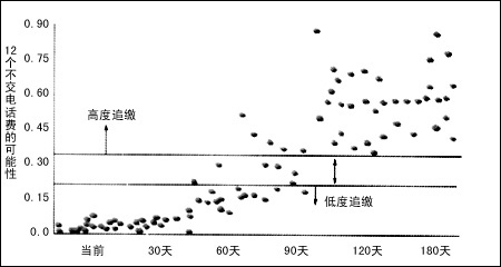 這樣,Bell Atlantic就能計(jì)算出有關(guān)客戶的概率可能性,包括客戶從一個(gè)月未交電話費(fèi)到兩個(gè)月未交的可能性;客戶從三個(gè)月未交電話費(fèi)到變成壞債的可能性,以及壞債客戶變成死債客戶的可能性。同時(shí),還對(duì)追交拖欠電話費(fèi)用的策略提供線索,確認(rèn)哪些帳戶應(yīng)該進(jìn)行追債活動(dòng);哪些帳戶有可能拖欠電話費(fèi);并且提供量化的追債策略,對(duì)不同的帳戶采用不同的辦法。