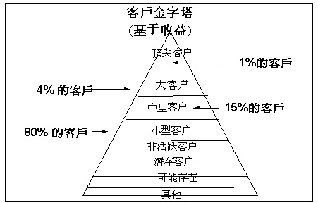 將數(shù)據(jù)以圖象化形式輸出,易于向你展示正在發(fā)生何事。簡單如一個金字塔,其頂部(百分之一)表示盈利最高的頂尖客戶,下一層為大客戶(百分之四),然后是中型(百分之十五)和小客戶(百分之八十),最后是不活躍的、潛在的、可能存在的客戶及其它各種等等。