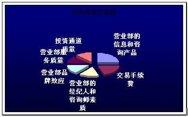 。。具筆者調(diào)查,現(xiàn)在對(duì)營(yíng)業(yè)部盈利最大的是機(jī)構(gòu)客戶或者大額個(gè)人投資者,而隨著股市行情的低彌,他們?cè)谶x取營(yíng)業(yè)部的考慮因素主要關(guān)鍵點(diǎn)及其所占比例如下圖: