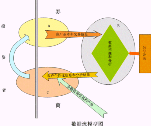 。。在整個的數(shù)據(jù)流循環(huán)模型中,可以分為三個模塊:A模塊,客戶通過交易通道進(jìn)行投資活動;B模塊,根據(jù)客戶的基本信息和交易信息,進(jìn)行大量的數(shù)據(jù)挖掘和數(shù)據(jù)分析,為領(lǐng)導(dǎo)決策進(jìn)行支持,并且得到客戶的個性化信息和各種分析結(jié)果;C模塊,根據(jù)各種數(shù)據(jù)的分析結(jié)果,同時根據(jù)投資咨詢師手中現(xiàn)有的信息產(chǎn)品,為客戶提供真正的個性化的咨詢服務(wù),并且把此個性化的咨詢服務(wù)即時傳遞給投資者,為客戶進(jìn)行下一次的投資活動而準(zhǔn)備。