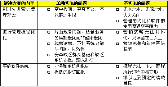 在CRM出現(xiàn)以前,企業(yè)為了解決市場、銷售和服務(wù)方面的問題,更好地吸引、獲得、保留和發(fā)展客戶,采取了各種方式,比如使用一套分銷管理的解決方案,或者請"點(diǎn)子公司"出謀劃策,或者尋求某個具體業(yè)務(wù)的優(yōu)化。以上這些做法往往只能完成局部的改進(jìn),或取得短期的效果,無法形成長期和整體的競爭優(yōu)勢。原因就在于這些解決方案都只提供了片面的、局部的解決方案,"頭痛醫(yī)頭,腳痛醫(yī)腳"不能綜合管理理念、業(yè)務(wù)流程和技術(shù)應(yīng)用這三個方面,系統(tǒng)地分析和解決問題。下表中分析了這些解決方案單獨(dú)實(shí)施或者不實(shí)施會帶來什么問題。