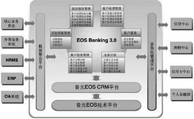 普元公司順應(yīng)中國銀行業(yè)發(fā)展的趨勢,綜合國內(nèi)外金融業(yè)的市場營銷和管理模型,把具有世界級水平的EOS平臺推廣到銀行業(yè),提供具有中國特色的“EOS銀行客戶經(jīng)理管理系統(tǒng)”。這套系統(tǒng)可以幫助銀行快速組織資源,面向客戶提升客戶服務(wù)、市場營銷水平,同時對客戶經(jīng)理的業(yè)績考核加強管理,為客戶經(jīng)理提供風險控制工具,為營銷主管部門決策提供支持。最終實現(xiàn)幫助銀行達到提高利潤、降低成本,提高銀行客戶滿意度及提高市場占有率的管理目標。