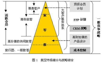 國(guó)內(nèi)主要航空公司都進(jìn)一步明確了市場(chǎng)細(xì)分與戰(zhàn)略組合的關(guān)系,凸現(xiàn)“以客戶為中心”的經(jīng)營(yíng)理念,如圖1所示。
