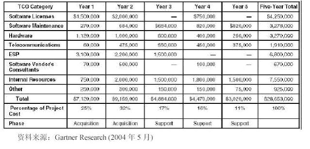 其它:這個(gè)類別涉及到上述種類中不含的TCO 成本,以便涵蓋項(xiàng)目評(píng)估流程期間的錯(cuò)誤與疏忽部分,并作為項(xiàng)目執(zhí)行期間的假設(shè)與業(yè)務(wù)狀況的變化。許多公司都納入的成本實(shí)例有項(xiàng)目意外事故、房地產(chǎn)、附加的與正在進(jìn)行的培訓(xùn)、以及T&E 等。
