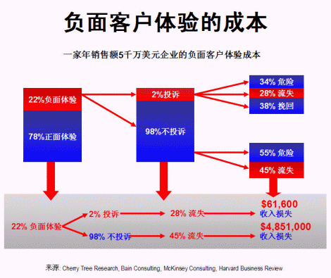 一家年銷售額五千萬(wàn)美元的企業(yè),假設(shè)正面客戶體驗(yàn)為78%,負(fù)面體驗(yàn)為22%,在所有負(fù)面體驗(yàn)中,只有2%的客戶投訴,其余98%大多數(shù)均不投訴,保持沉默(這與現(xiàn)實(shí)情況頗為吻合)。在2%投訴客戶中,有34%經(jīng)過(guò)處理仍然未能令客戶完全滿意,尚有流失的危險(xiǎn);28%的客戶在處理后依然流失,余下38%的客戶則感到滿意,繼續(xù)留下。對(duì)大部分(98%)沒(méi)有投訴的客戶,因公司對(duì)他們的不滿意并不知情,所以沒(méi)有采取行動(dòng),55%的客戶有隨時(shí)流失的危險(xiǎn),其余45%已經(jīng)流失。