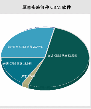 CRM軟件,或在線CRM軟件”;也有28.57%的被調(diào)查者選擇自行開發(fā)CRM軟件;相比于前面兩種類型,被調(diào)查者對傳統(tǒng)CRM軟件的需求則處于一個較低的水平,有16.36%的被調(diào)查者仍然選擇有興趣在兩年投資傳統(tǒng)的CRM軟件。雖然ASP的模式在中國市場上的認(rèn)知度仍然有限,但是市場對on-demand