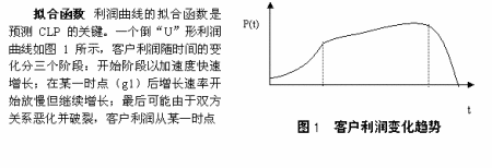 客戶利潤曲線除了倒“U”形外,可能還有各種其它形狀。其它形狀CLP預(yù)測的關(guān)鍵是找到合適的客戶利潤曲線擬合函數(shù)。為此公司需要建立一個(gè)客戶利潤曲線擬合函數(shù)庫,庫中存放各種形狀實(shí)際客戶利潤曲線的擬合函數(shù)。當(dāng)客戶歷史利潤曲線不符合倒“U”形變化規(guī)律時(shí),在庫中尋找新的擬合函數(shù)。如庫中沒有現(xiàn)成的滿足要求的擬合函數(shù),則建立新的擬合函數(shù),并加入庫中。擬合函數(shù)確定后,參照倒“U”形CLP的預(yù)測方法和步驟便不難算出當(dāng)前客戶的CLP。當(dāng)前分析型CRM系統(tǒng)具備的數(shù)據(jù)庫技術(shù)、數(shù)據(jù)挖掘技術(shù)、知識(shí)發(fā)現(xiàn)技術(shù)等有效的智能工具去識(shí)別客戶利潤曲線,進(jìn)而確定擬合法中的各參數(shù),可以容易的計(jì)算出CLP。