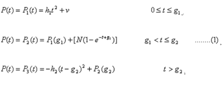式中,P(t)為客戶第t個(gè)時(shí)間單元的客戶利潤。P1(t)為一二次增函數(shù),表示客戶利潤以一定的加速度(2h1)快速增加;P2(t)為一上漸近線函數(shù),表示客戶利潤一直增長但增長越來越慢,且始終越不過一個(gè)利潤最高限,最高限為(P1(g1)+N);P3(t)為一個(gè)二次降函數(shù),表示客戶利潤以一定的加速度(2h2)銳減。參數(shù)v、h1、h2、g1、g2、N都是正常數(shù)。v是客戶第一次購買帶給公司的利潤,通常這個(gè)值不高,甚至接近0(不考慮獲取成本,否則v常為負(fù)值)。h1、h2反映了客戶利潤增長和下降的加速度。g1、g2是利潤曲線發(fā)生轉(zhuǎn)折的兩個(gè)時(shí)點(diǎn)。N是g1時(shí)點(diǎn)后利潤總增幅的極限。