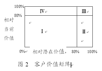 (二)確定客戶當(dāng)前相對價(jià)值和客戶相對潛在價(jià)值通過預(yù)測,識(shí)別出了客戶當(dāng)前價(jià)值CCV和增值潛力CPV。但是,這兩個(gè)維度指標(biāo),均以絕對價(jià)值形式出現(xiàn)對客戶進(jìn)行細(xì)分并不理想(張國方,金國棟,2003(3)),在一定程度上會(huì)影響到理論應(yīng)用的方便性(簡便性)。因此,可以采用更加明了和更具有實(shí)踐操作性的維度指標(biāo)——客戶當(dāng)前相對價(jià)值和客戶相對潛在價(jià)值!翱蛻舻南鄬Ξ(dāng)前價(jià)值”是指某一客戶提供的當(dāng)前價(jià)值與企業(yè)未來可望實(shí)現(xiàn)的當(dāng)前價(jià)值總額的比值;而“客戶的相對潛在價(jià)值”是某一客戶提供的增值價(jià)值與企業(yè)未來可望實(shí)現(xiàn)的全部最大增值價(jià)值的比值。