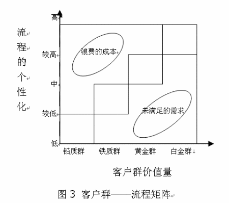 圖中橫軸代表客戶群價(jià)值量,從“鉛質(zhì)客戶群”到“白金客戶群”過渡?v軸表示業(yè)務(wù)流程的個(gè)性化程度(包括流程的靈活性、流程的活動(dòng)承擔(dān)者的設(shè)置、流程中的活動(dòng)要素的配置等),是一種與客戶群價(jià)值量相對應(yīng)的供應(yīng)方面的流程特征。左上方的橢圓圈表示對價(jià)值量低的鉛質(zhì)群、鐵質(zhì)群客戶設(shè)置了個(gè)性化較高的流程,這表明企業(yè)資源配置不合理,因而有些資源的投入大于產(chǎn)出,從而產(chǎn)生過高的成本。右下方的橢圓圈則代表了未被滿足的需求。用很標(biāo)準(zhǔn)化的、缺乏人情味的流程向高價(jià)值的黃金群客戶、白金群客戶提供產(chǎn)品和服務(wù),將難以讓這些客戶滿意,從而導(dǎo)致高價(jià)值客戶的流失。圖的中間部分,四個(gè)矩形框的對角線位置則代表了客戶群價(jià)值和流程個(gè)性化恰當(dāng)?shù)钠ヅ。因此,企業(yè)可在四個(gè)矩形框的各自兩條對角線相交部分設(shè)置“白金客戶群流程、黃金客戶群流程、鐵質(zhì)客戶群流程、鉛質(zhì)客戶群流程”這四類流程,以此找到客戶群——由資源創(chuàng)造的產(chǎn)品和服務(wù)——流程群的最佳匹配。從圖中也可看出,鉛質(zhì)客戶群流程的標(biāo)準(zhǔn)化程度最高,通常不用提供特殊的個(gè)性化的服務(wù)及產(chǎn)品。白金群客戶流程的定制化則最高,企業(yè)需要為其量身打造流程。顯然這兩個(gè)流程的資源分配存在極大的差異。