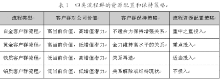 流程由活動(dòng)、活動(dòng)的邏輯順序、活動(dòng)的實(shí)現(xiàn)方式、活動(dòng)的承擔(dān)者四個(gè)基本要素組成。通過活動(dòng)的整合來產(chǎn)生“流程多面手”或活動(dòng)講廢除來減少成本,利用信息技術(shù)將“串聯(lián)”活動(dòng)變成“并聯(lián)”活動(dòng)來改變活動(dòng)斬邏輯順序以提高流程效率,或者改變活動(dòng)承擔(dān)者的數(shù)量或素質(zhì),這些都將導(dǎo)致流程群資源分配的變動(dòng)。例如,銀行的業(yè)務(wù)流程設(shè)置:低價(jià)值客戶以電子設(shè)備的自助服務(wù)為主;中價(jià)值客戶以柜面服務(wù)為主;高價(jià)值客戶以大戶室一對一服務(wù)為主;設(shè)置專業(yè)化的理財(cái)中心,由客戶經(jīng)理全程代為辦理各項(xiàng)業(yè)務(wù),同時(shí)由高素質(zhì)的理財(cái)專家根據(jù)客戶的風(fēng)險(xiǎn)收益偏好提供高質(zhì)量的理財(cái)產(chǎn)品等?梢,不同客戶其流程的資源配置差異較大。依據(jù)客戶群——流程矩陣,下表描述了四類流程群所對應(yīng)的四類客戶群的四種資源配置方式。