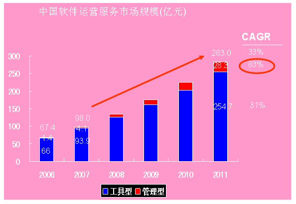 2006中國軟件運營服務(SaaS)產業(yè)的規(guī)模為68億元,2011年將突破400億,達到406億元,未來五年的復合增長率達到43%。這是國內ICT領域權威研究機構計世資訊(CCW Research)在其最新發(fā)布的《軟件業(yè)的下一個十年——中國軟件運營服務(SaaS)市場發(fā)展趨勢研究報告》中指出的。