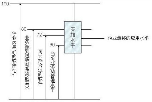 如果用一個數(shù)量化的概念來表達(dá)的話,假定行業(yè)內(nèi)最好的軟件是100分,企業(yè)做到極致對系統(tǒng)的需求可能是80分,當(dāng)然也可能沒有一個軟件能滿足企業(yè)所有的需求,但從整體上,一個企業(yè)的主體需求一定在行業(yè)內(nèi)最好的軟件標(biāo)桿之下。而當(dāng)前的業(yè)務(wù)和管理水平一般到不了極致,假設(shè)是60分,那選擇的軟件70-75分一定是合適的,高于當(dāng)前需求,而不要高得太多,最終的實施水平是一個區(qū)間,這取決于實施商的能力和企業(yè)的能力,可能會低于企業(yè)當(dāng)前業(yè)務(wù)和管理水平,也可能使系統(tǒng)超水平發(fā)揮,而企業(yè)最終的應(yīng)用水平一般就在這個區(qū)間里游動了。這個模型看起來很理論化,操作時需要考慮很多的因素,但是非常有價值的判斷標(biāo)準(zhǔn)。