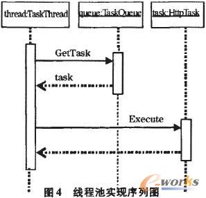 為解決頻繁創(chuàng)建線程導(dǎo)致的線程生命周期開(kāi)銷和資源消耗問(wèn)題,借鑒在網(wǎng)絡(luò)服務(wù)中常見(jiàn)的線程池技術(shù)。由于服務(wù)器需要處理大量的網(wǎng)絡(luò)請(qǐng)求,為避免大量的線程創(chuàng)建和銷毀所導(dǎo)致的問(wèn)題,通常使用線程池來(lái)處理網(wǎng)絡(luò)請(qǐng)求,即在線程池中預(yù)先創(chuàng)建一定數(shù)量的線程,當(dāng)新的網(wǎng)絡(luò)任務(wù)到達(dá)時(shí),由線程池中一個(gè)空閑線程執(zhí)行該任務(wù),任務(wù)執(zhí)行完畢后該線程并不銷毀,而是重新返回線程池中并等待新的任務(wù)到達(dá)。對(duì)于J2ME設(shè)備需要頻繁連接網(wǎng)絡(luò)的情況下,線程池不失為一個(gè)提高性能、節(jié)約系統(tǒng)資源的好方法。圖4給出了線程池實(shí)現(xiàn)的序列圖。