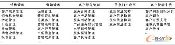 CRM應(yīng)用系統(tǒng)功能平臺對應(yīng)于平臺架構(gòu)中的應(yīng)用功能層,是系統(tǒng)平臺的卞體部分。基于對A企業(yè)的需求分析及B/S的平臺架構(gòu)特點,筆者將系統(tǒng)功能綜合歸納為銷信管理、營銷管理、客戶服務(wù)管理、信息門戶應(yīng)用及客戶智能支持5大模塊,它們共同構(gòu)成的系統(tǒng)的功能平臺如圖2所示,詳細(xì)功能設(shè)計如表1所示。