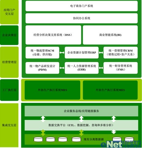 根據企業(yè)管理發(fā)展戰(zhàn)略及目標,需要考慮建設“集成化數(shù)字管控制造系統(tǒng)”,涵蓋企業(yè)決策層、企業(yè)經營管理層。根據整體業(yè)務模式,企業(yè)經營管理層又可以進一步分解為公司管理層和工廠執(zhí)行層;從信息化戰(zhàn)略支撐角度可以分解為企業(yè)門戶交互層、應用系統(tǒng)層、應用集成層和網絡支撐層。實現(xiàn)企業(yè)信息流、資金流、物流、商物流的高度集成、統(tǒng)一,為企業(yè)生產、經營提供強有力的信息化支撐。