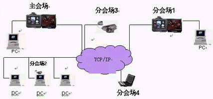 會議的組織,召開,管理由主會場來完成。因此,主會場的視頻,聲音,通知,指示,下達的文件資料各分會場都應該收到。當某分會場發(fā)言時,其視頻,聲音同樣要傳送給其他會場。(如下圖所示)上述所有動作的完成依賴組播技術(shù)。通過組播技術(shù)把主會場的各種數(shù)據(jù)發(fā)送到參加會議的分會場中,而且把發(fā)言分會場的視音頻數(shù)據(jù)發(fā)送給其他會場:即主會場和發(fā)言分會場的各種數(shù)據(jù)只要在網(wǎng)上發(fā)送一次,其他會場都將收到此數(shù)據(jù),(這就是有別于點對點通信方式的地方)而與這兩個會場在同一網(wǎng)段卻不參加會議的非成員不會收到數(shù)據(jù)(只要設(shè)備支持,這也是有別于廣播的地方)。因此,當會議成員增加時,不會產(chǎn)生信息傳輸量劇增,帶來無法忍受的網(wǎng)絡(luò)延時和抖動。
