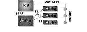 使用TAPI、S.100和H.100規(guī)格,服務(wù)點的主機、交換和媒體資源能有效的集成到一個交換平臺中(見圖三)早期的集成結(jié)構(gòu)受非冗余備份交換的限制,不能滿足服務(wù)供應(yīng)商的需求。S.100和TAPI也不能滿足諸如處理器冗余備份和資源分布的要求,應(yīng)用于PC平臺的H.100標(biāo)準(zhǔn)也不支持“無信號點的故障“(no signal point of failure)的載體需求。而Sigma計劃的支持全標(biāo)準(zhǔn)兼容性克服了這些限制。
