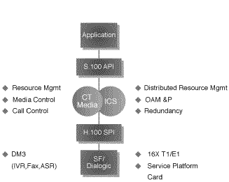 Sigma計劃的硬件平臺支持H.110的cPCI(CompactPCI)總線。媒體處理通過配置Dialogic高密度的DM3TM硬件來操作,它提供諸如自動語音識別、傳真、互聯(lián)網(wǎng)語音和編碼、以及交互式語音應(yīng)答功能。Summa Four通過集成它的接口控制卡(ICC)來提供高密度的網(wǎng)絡(luò)接口,最大可支持16個T1/E1。另外,服務(wù)資源設(shè)備,如信令、號音生成、會議、編解碼、以及互聯(lián)網(wǎng)語音轉(zhuǎn)換等,將通過Summa Four的服務(wù)平臺卡(SPC)支持,它最多可有32個DSP。ICC和SPC均可由Summa Four的VCO產(chǎn)品家族支撐。通過H.110總線,任何與標(biāo)準(zhǔn)兼容的制造商制造的硬件組件都能輕易的加入到平臺中。
