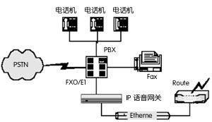 在這種應用方式中, IP語音網關采用FXO接口與PBX(用戶電話交換機)互連,電話直接接入PBX,未接入PBX的外部電話,經電話公網(PSTN)與PBX相連。