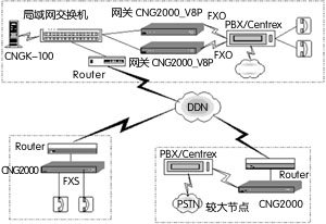 用這種方式組建IP語音系統(tǒng),各節(jié)點可根據接入的用戶數(shù)及通信話務量大小,靈活匹配一臺或多臺CNG-2000 IP接入網關。實際撥打時只需撥打配置好的號碼,撥號方式簡單。