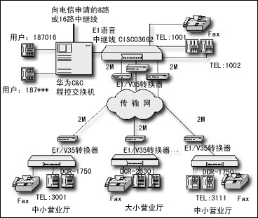 市聯(lián)通通過在Cisco 3662路由器上配置一個(gè)NM-HDV-1E1-30E語音中繼模塊,通過75歐姆同軸電纜與華為程控交換機(jī)的E1接口板相連,提供30路話音,該路由器用作語音網(wǎng)關(guān)。各網(wǎng)點(diǎn)配置神州數(shù)碼路由器,配置MR-VIC-2FXS或MR-NM-4FXS語音模塊,提供多路語音。
